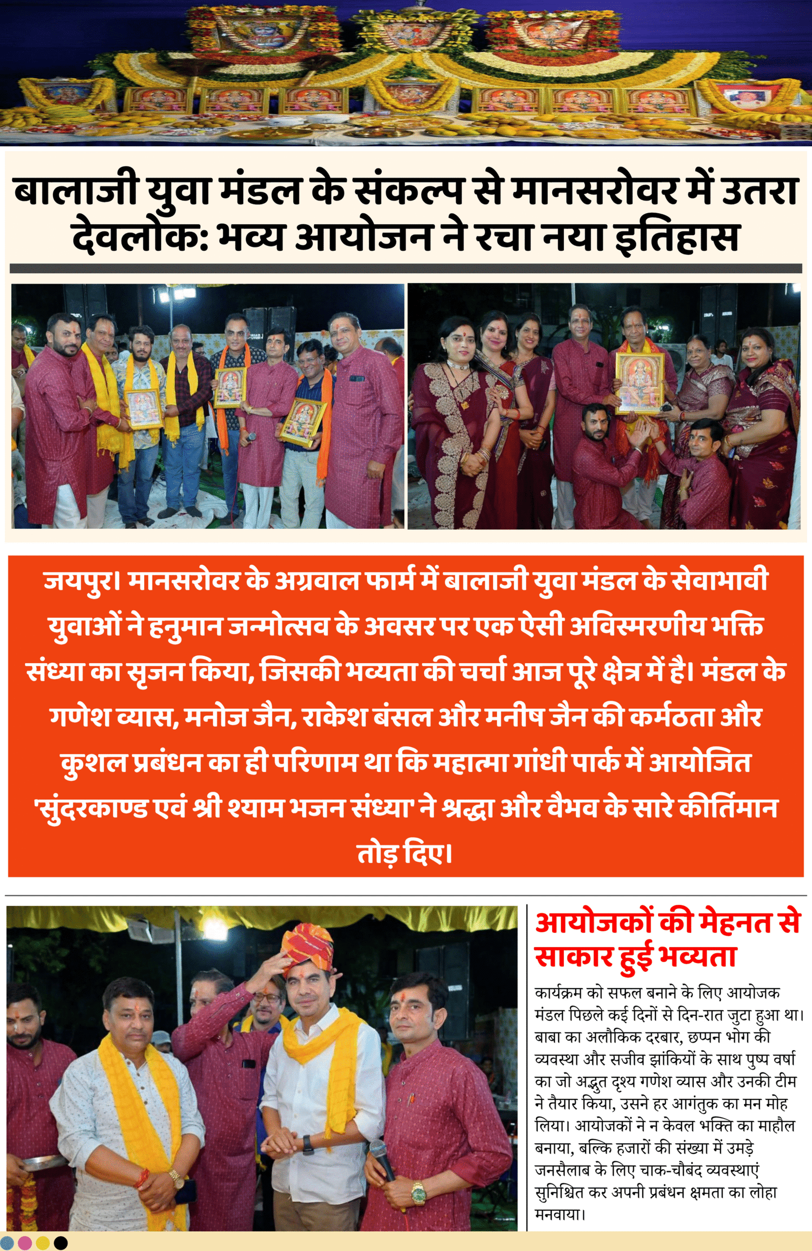 जयपुर। मानसरोवर के अग्रवाल फार्म में बालाजी युवा मंडल के सेवाभावी युवाओं ने हनुमान जन्मोत्सव के अवसर पर एक ऐसी अविस्मरणीय भक्ति संध्या का सृजन
